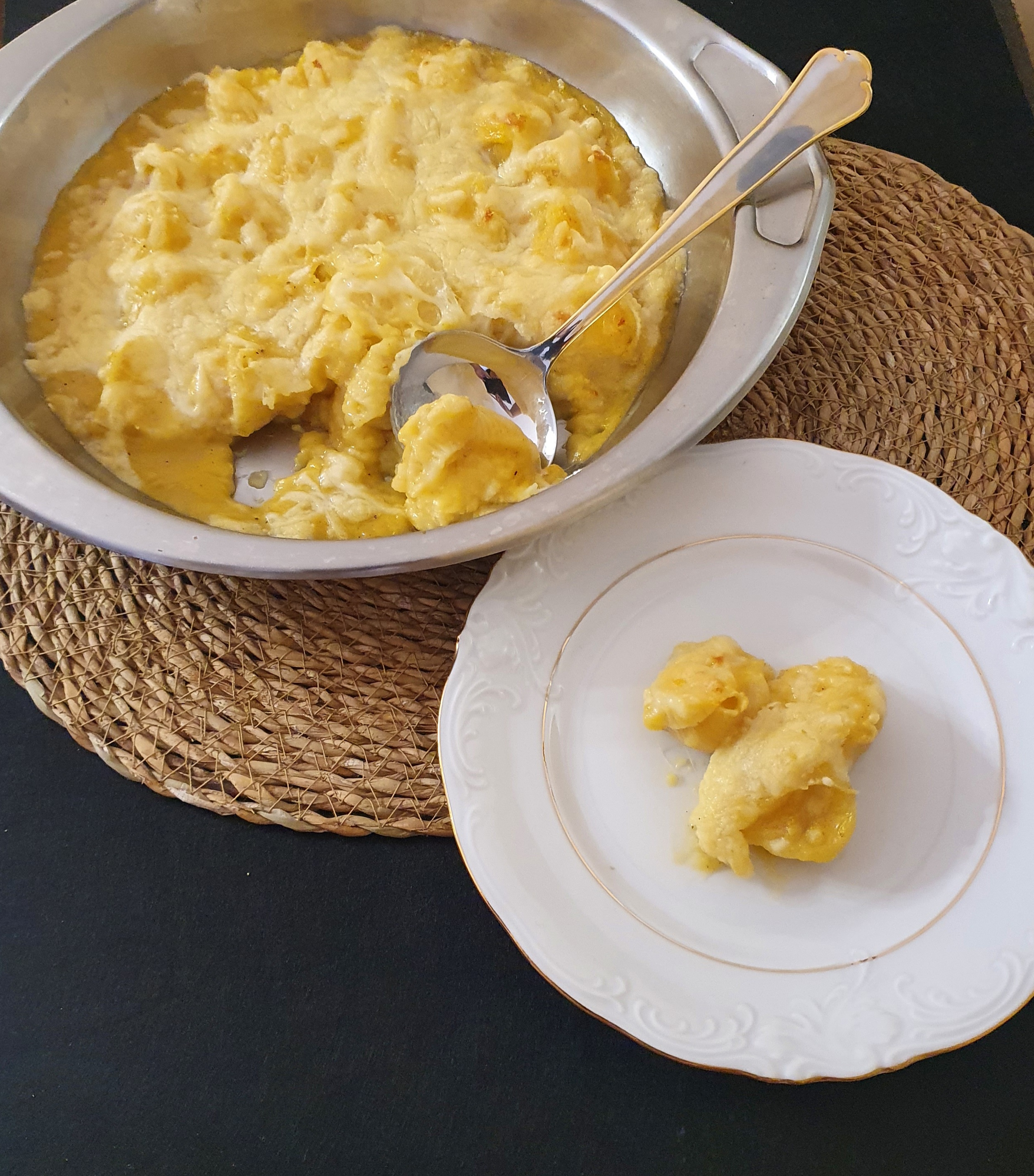 Retire la salsa bechamel del vaso a un bol y reserve. Refresque los galets con agua fría, rellénelos con el relleno de la manga pastelera y colóquelos en la bandeja de horno. Cubra los galets con la salsa bechamel, espolvoree con el queso rallado.