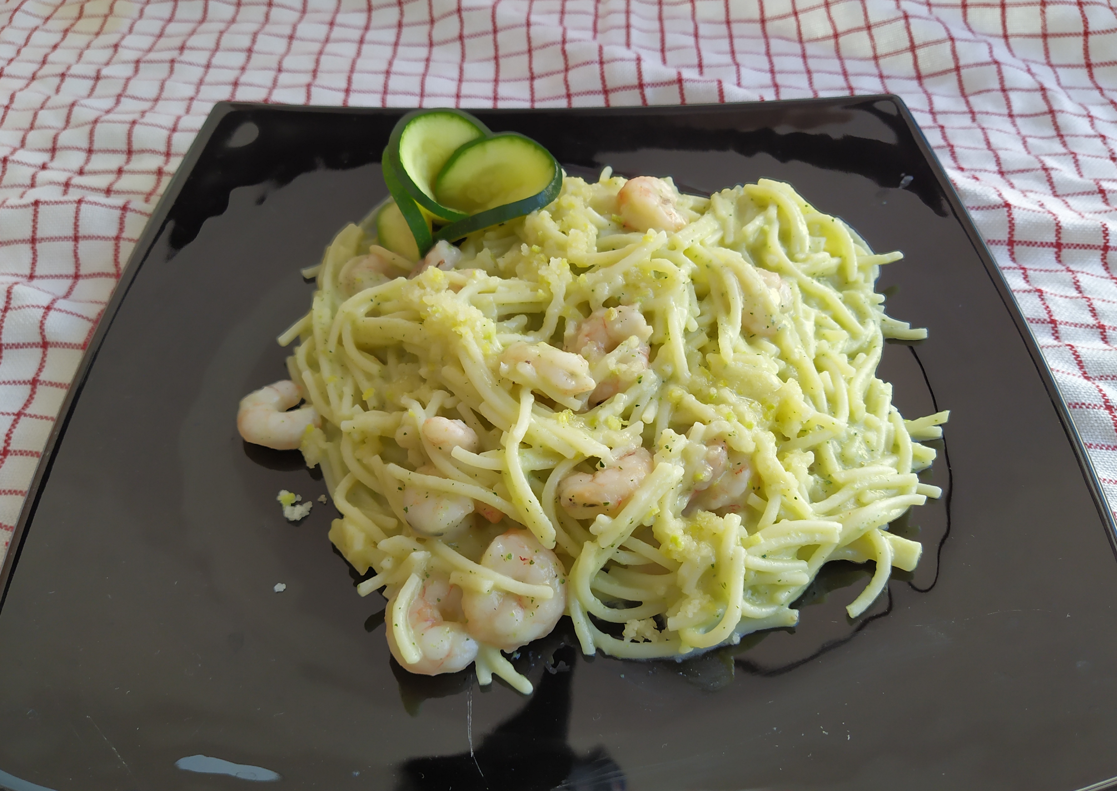 Tagliatelle al limón con calabacín y langostinos