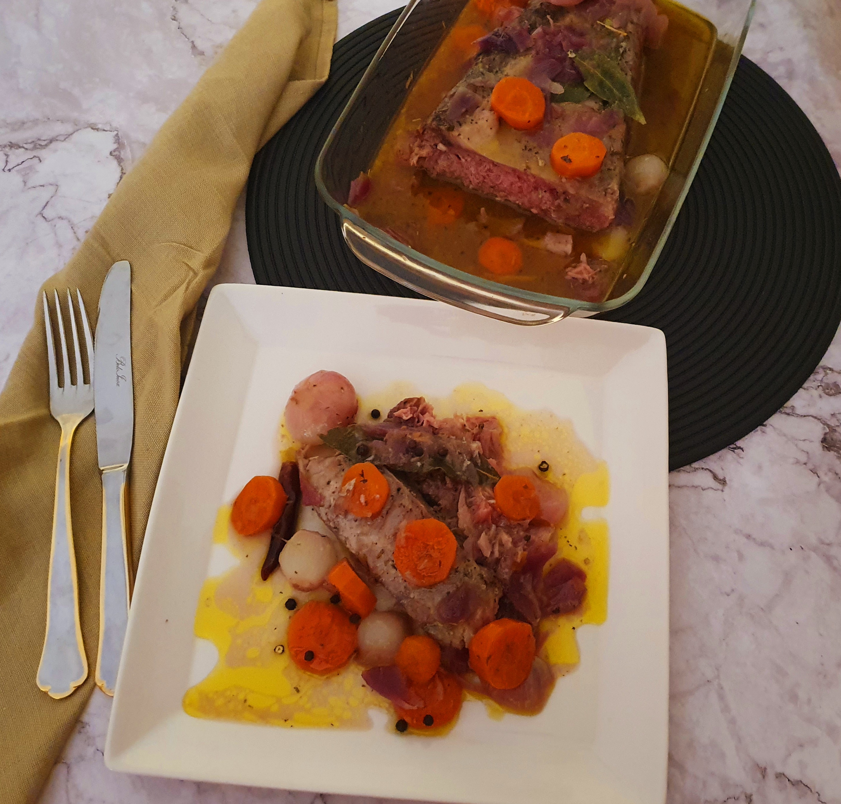 Desenvuelva el atún y póngalo en una fuente junto con la salsa, para que vaya cogiendo el sabor. Cuando se haya enfriado, corte el atún en rodajas finas y sírvalo con la salsa a temperatura ambiente o frío.