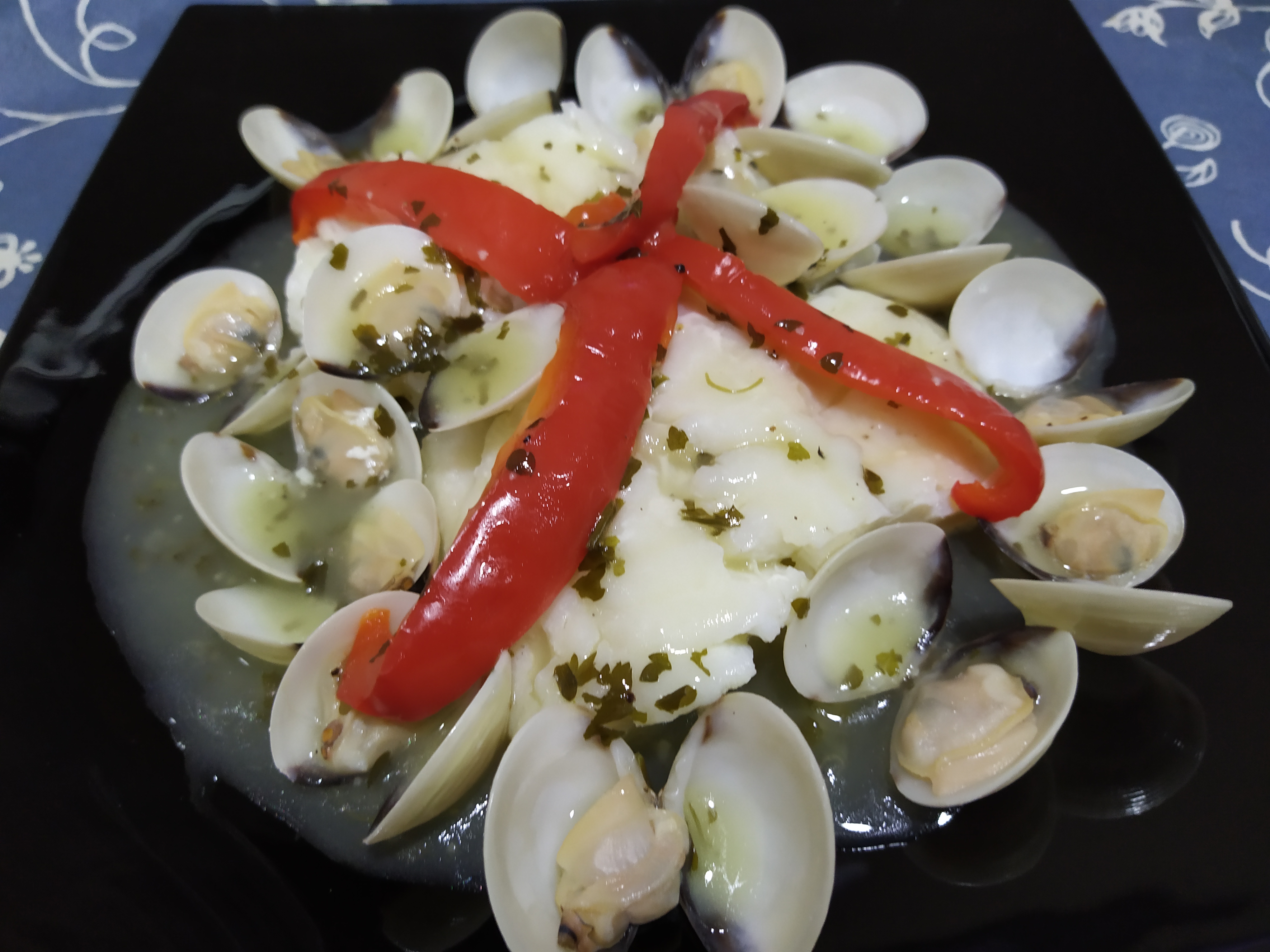 Deje caer en el vaso el líquido del papel a través del recipiente Varoma. Retire el recipiente Varoma, añada al vaso el perejil picado y programe 2 min/Varoma/vel 2. Mientras tanto, añada las chirlas reservadas a la fuente del bacalao. Vierta la salsa del vaso por encima y sirva inmediatamente.