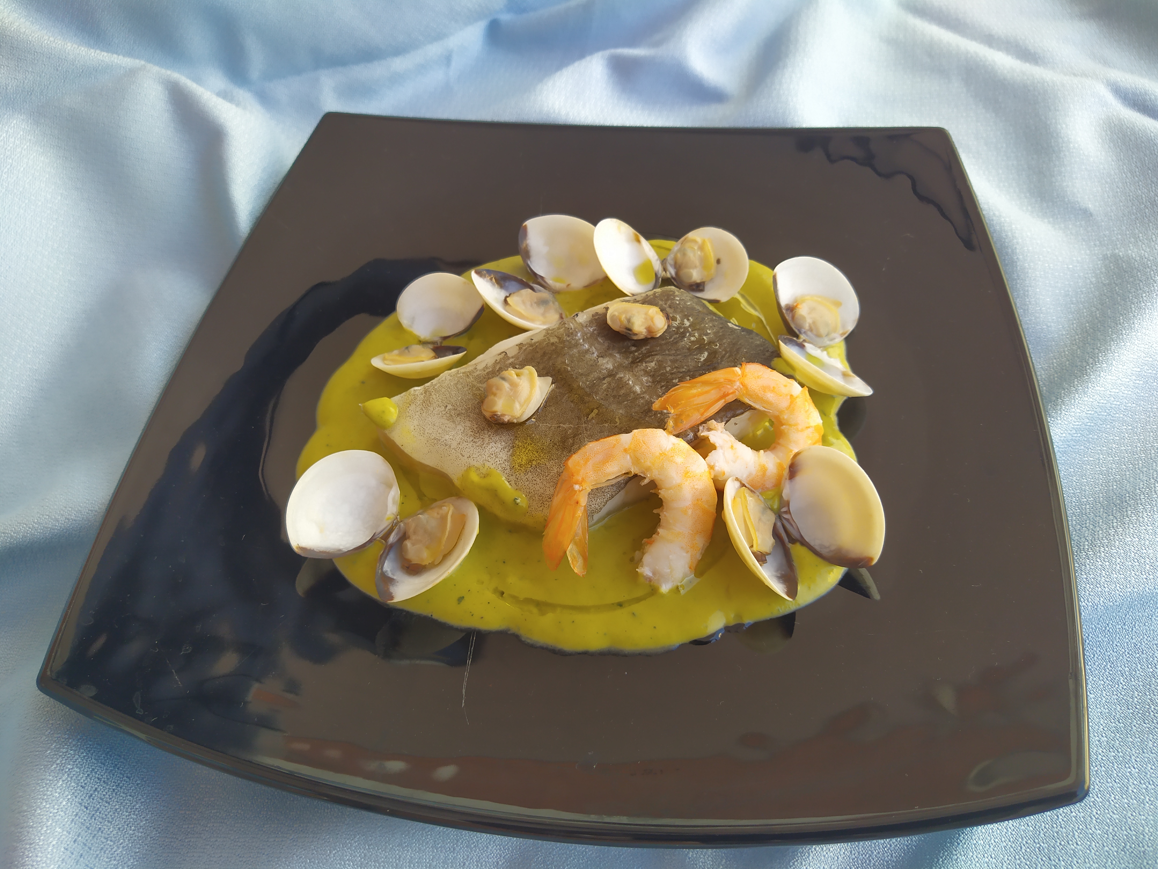 Añada al vaso la leche y triture 30 seg/vel 10. Ponga el bacalao, los gambones y las almejas en una fuente. Riegue con la salsa y sirva.