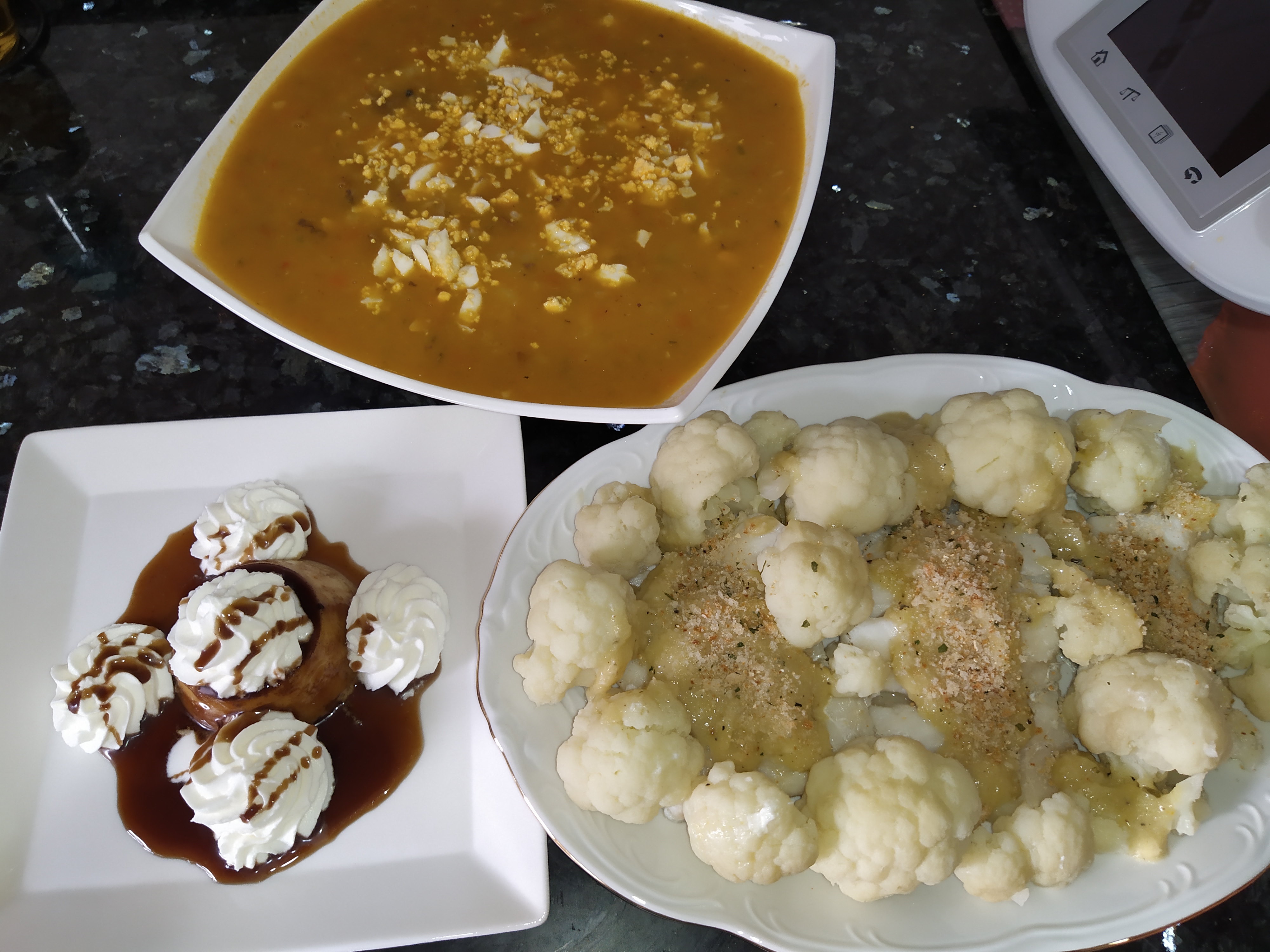 Menú: Patatas con almejas y calamares. Bacalao con coliflor y salsa de puerros. Flan de manzana