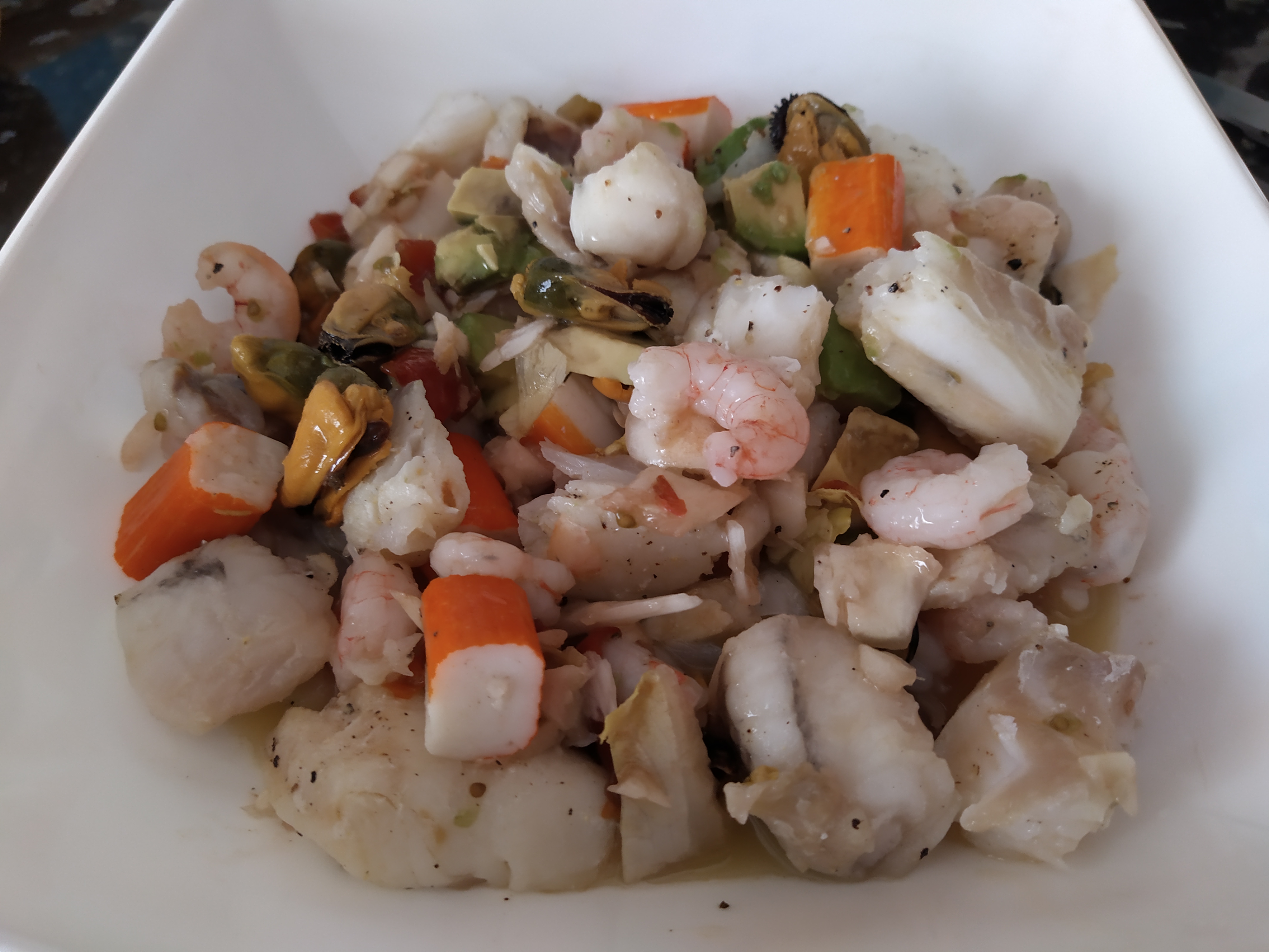 Introduzca el cestillo en el vaso con los mejillones y sitúe el recipiente Varoma en su posición con los gambones. Coloque la bandeja Varoma con el mero y espolvoree con ½ cucharadita de sal y 1 pellizco de pimienta. Tape el Varoma y programe 6 min/Varoma/vel 2. Retire el Varoma y con la muesca de la espátula, extraiga el cestillo. Quite las valvas de los mejillones, córtelos por la mitad y póngalos en un bol junto con el mero. Pele los gambones, córtelos por la mitad y añádalos al bol. Añada los palitos de cangrejo y el aguacate. Vacíe el vaso.
