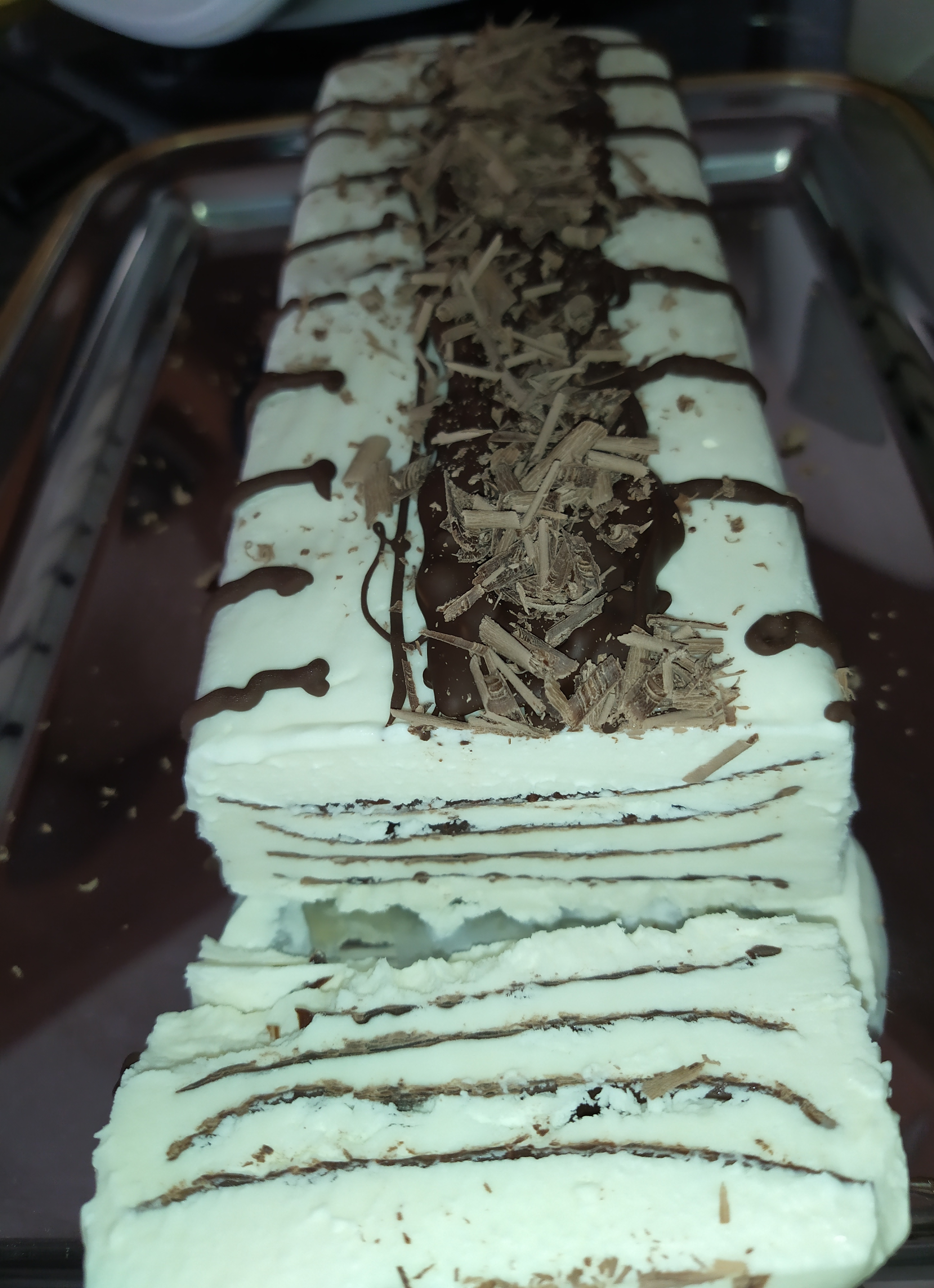 Desmolde el helado en una bandeja y retire el film transparente. Funda el chocolate en el microondas, dentro de una manga pastelera. Espere a que se temple, corte la punta y decore la superficie del helado con líneas de chocolate. Decore con virutas de chocolate antes de servir.