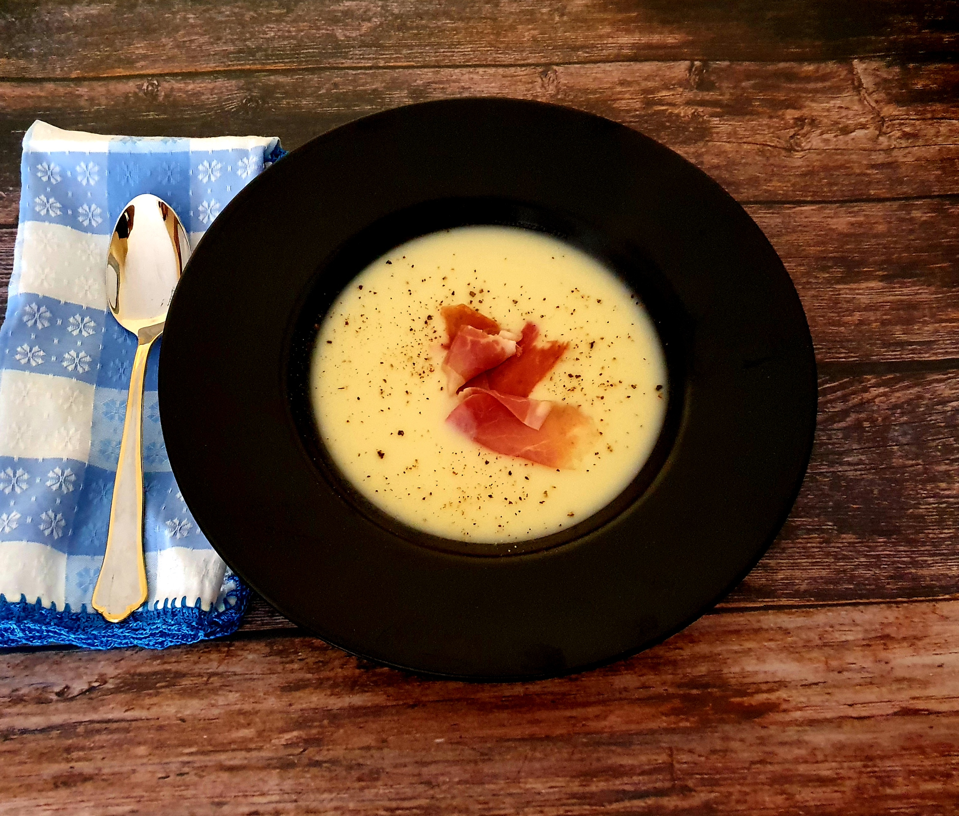 Crema de puerros y pera con jamón