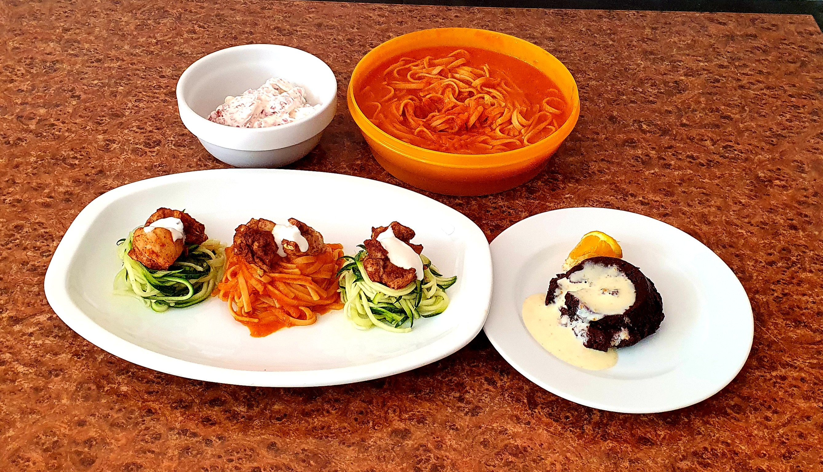 Menú: Dip de huevo y jamón. Pollo marinado con zoodles y espaguetis. Volcán de chocolate con naranja.