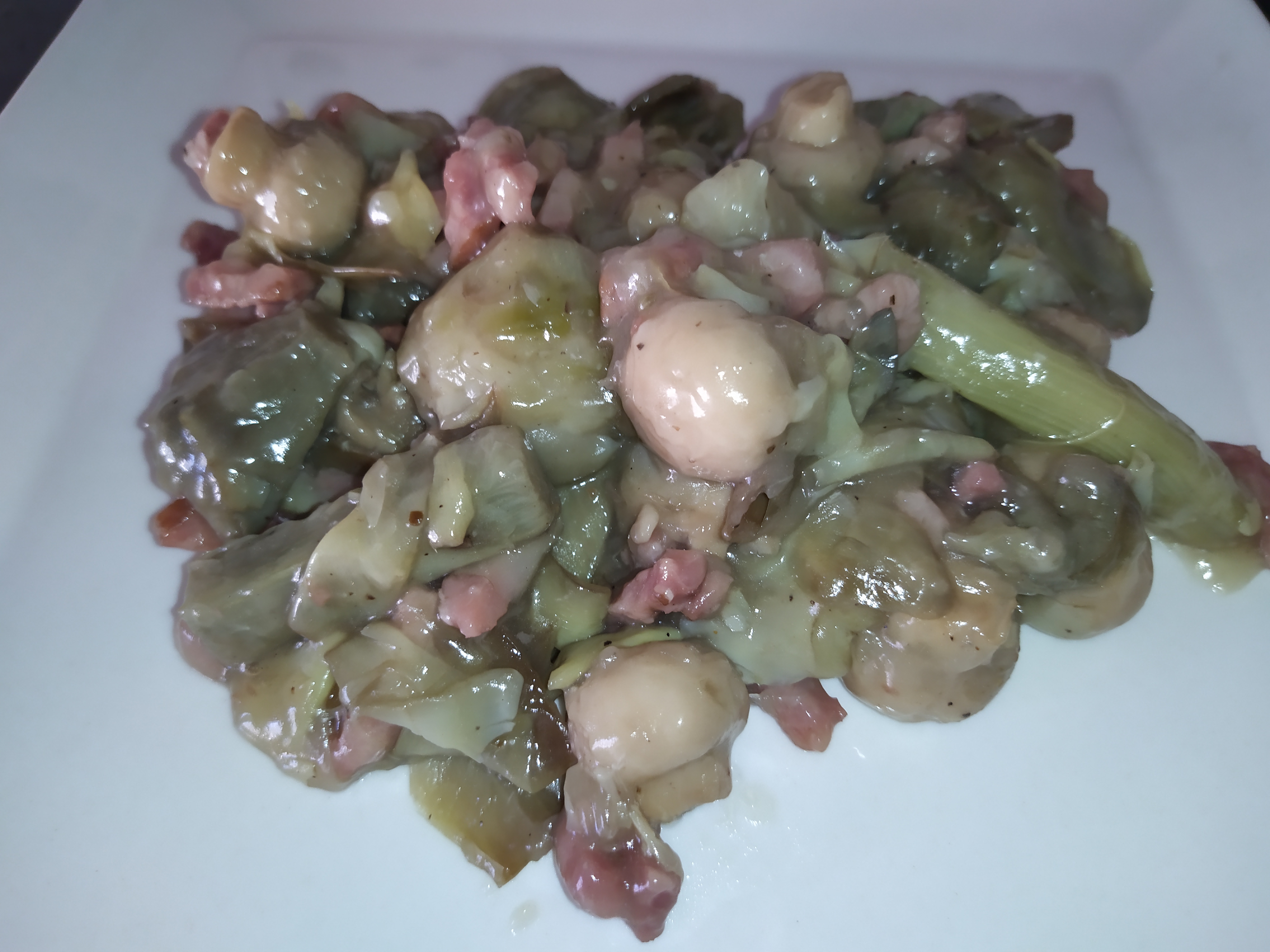 Alcachofas con champiñones y beicon