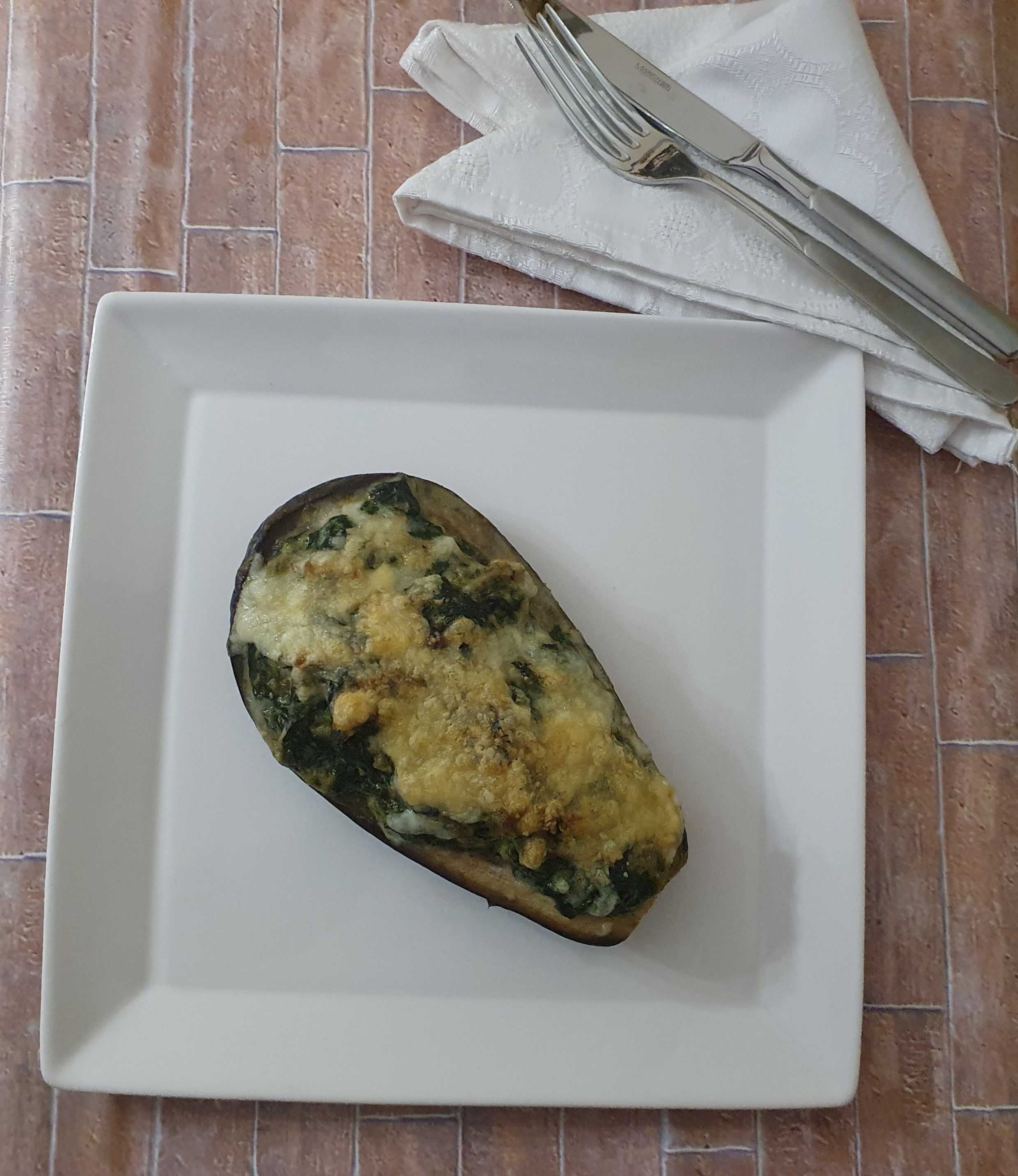 Coloque las berenjenas con la piel hacia abajo en una fuente refractaria, rellénelas con las espinacas y espolvoree con el queso rallado.
