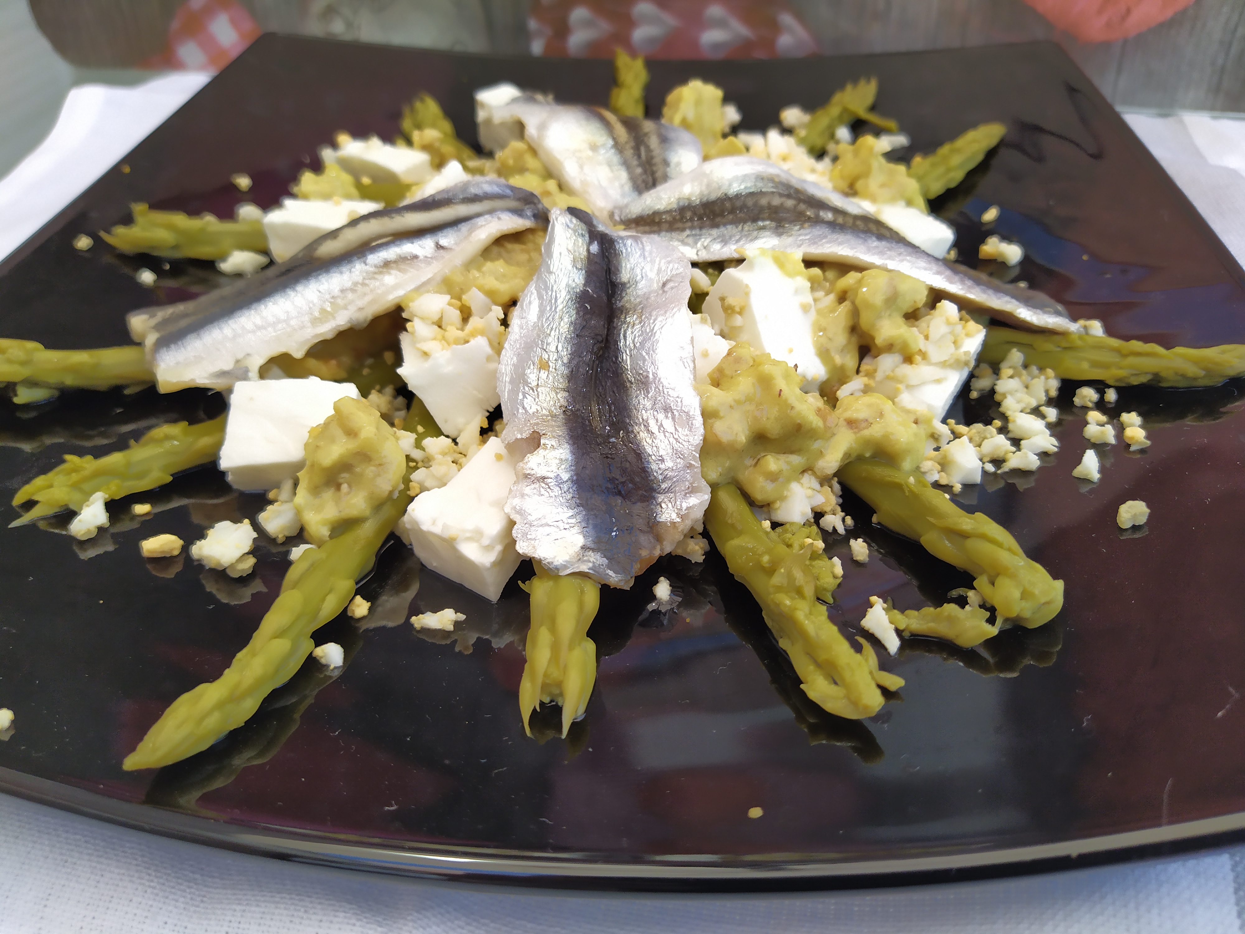 Ponga en el vaso el huevo duro pelado y trocee 2 seg/vel 4. Retire a la fuente sobre los espárragos y el queso fresco.