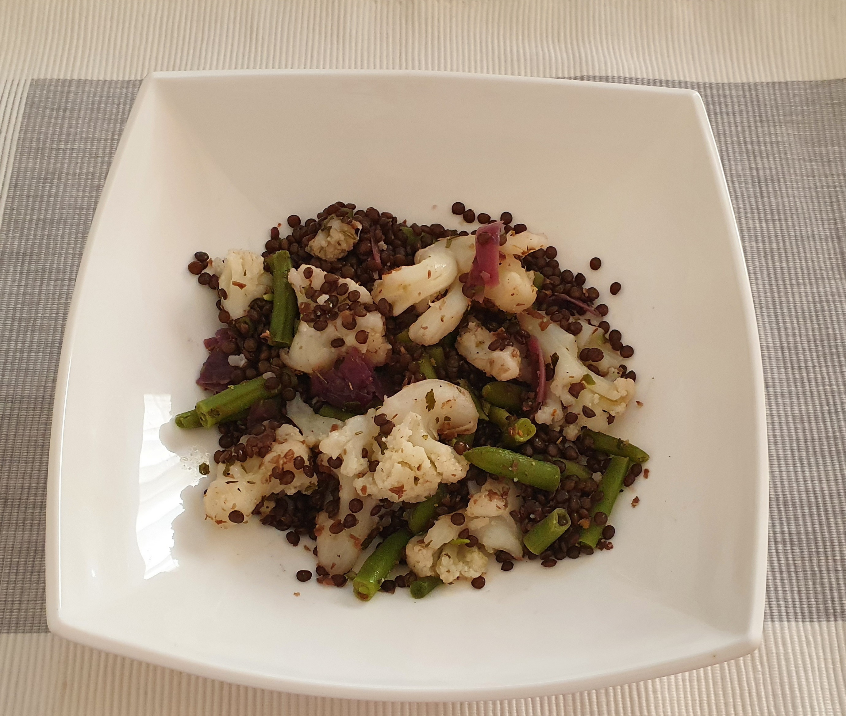 Ponga en el vaso las lentejas escurridas, el agua, la hoja de laurel, el ajo, 50 g de cebolla roja en gajos y ½ cucharadita de sal. Introduzca el cestillo con las judías y los ramilletes de coliflor y programe 25 min/100°C/giro inverso/vel cuchara. Con la muesca de la espátula, extraiga el cestillo y vierta las verduras en una ensaladera. Escurra las lentejas a través del cestillo, retire la hoja de laurel y vierta con las verduras. Aclare el vaso.