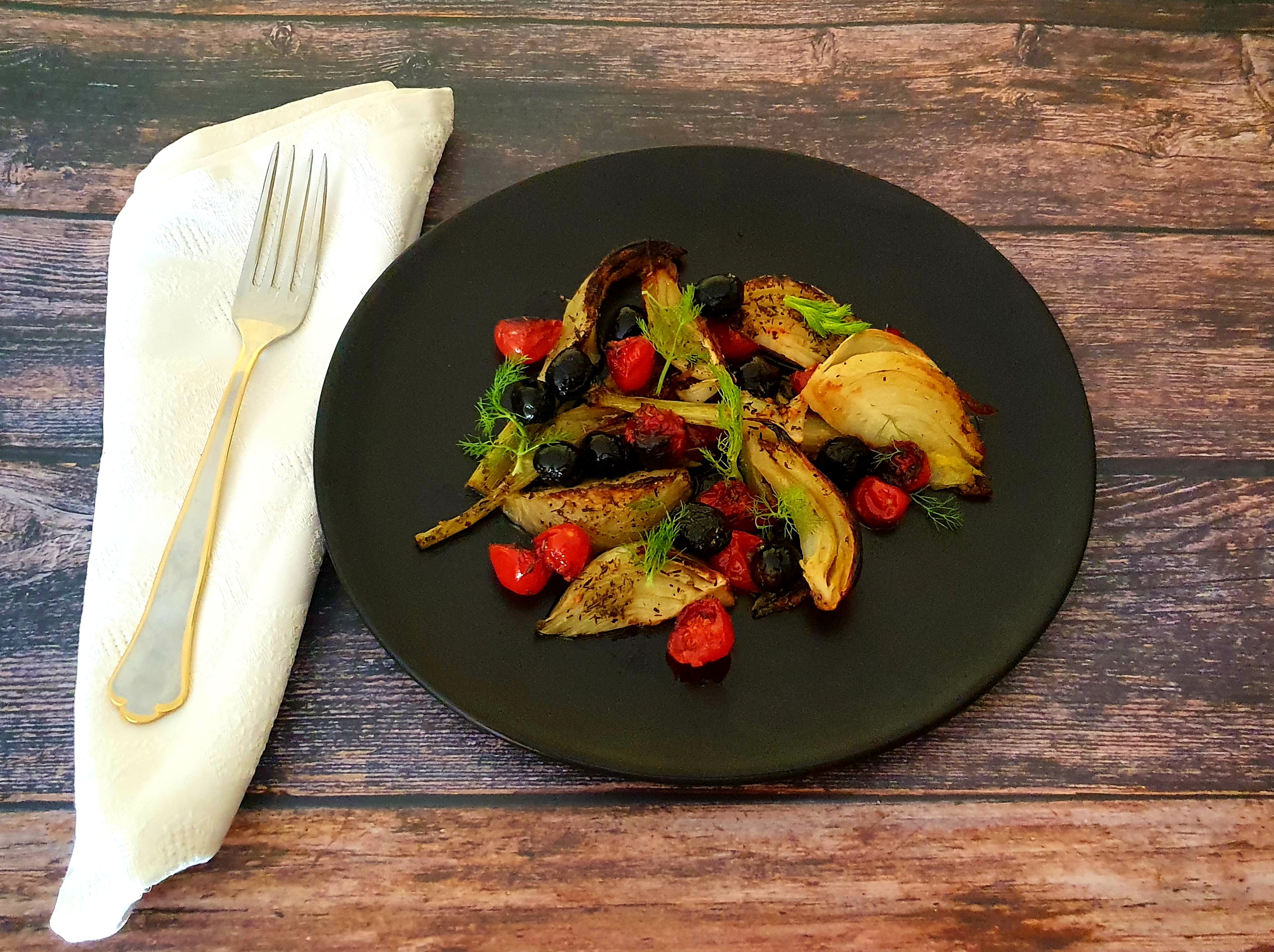 Vierta el agua y 2 cucharaditas de sal en el vaso. Introduzca el cestillo con el hinojo y programe 14 min/Varoma/vel 1. Con la muesca de la espátula, extraiga el cestillo, escurra el hinojo y póngalo en una fuente de horno. Reparta por encima los tomates cherry y las aceitunas. Vacíe el vaso.