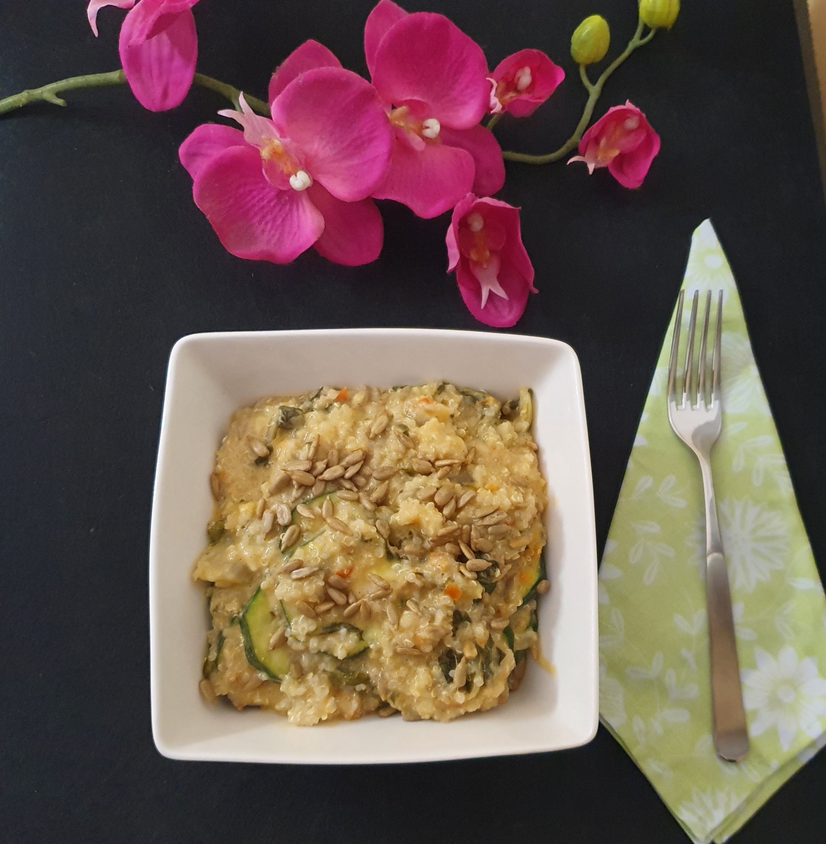 Incorpore el calabacín, las acelgas y la sal y programe 10 min/100°C/giro inverso/vel cuchara. Vierta en el bol junto con la quinoa, añada las pipas y mezcle bien con la espátula. Reserve.
