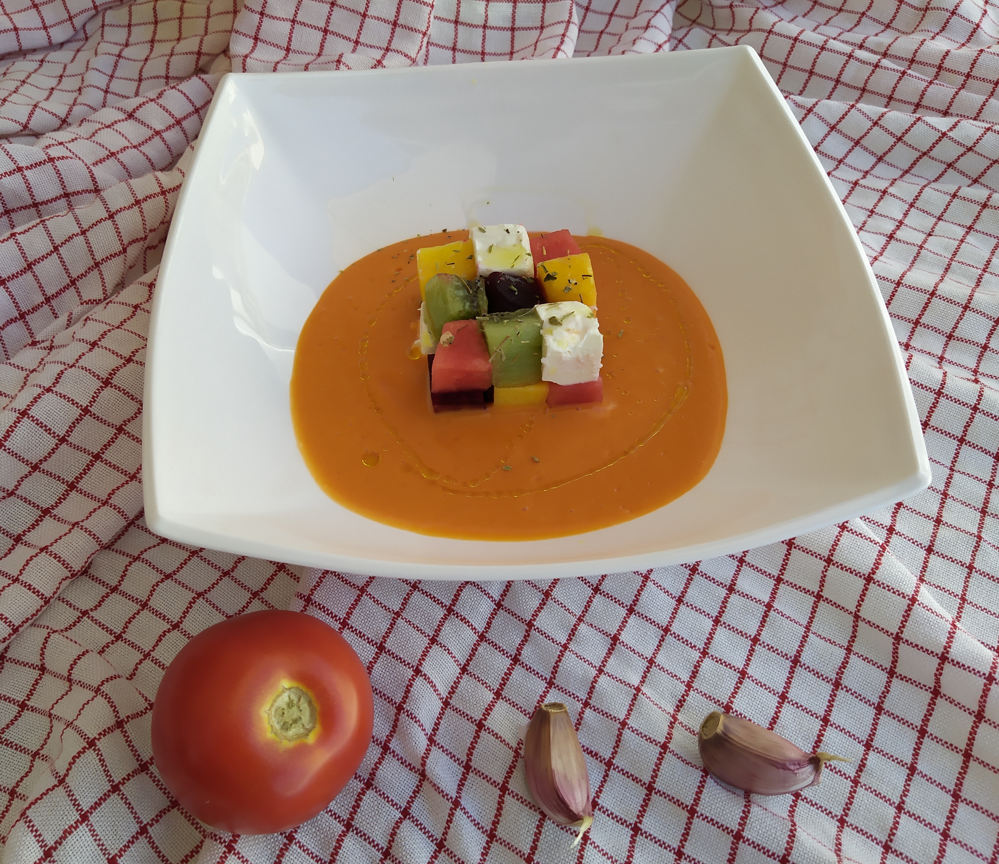 Forme, en el centro de 6 platos, los cubos intercalando los dados de fruta y verdura reservados y el queso fresco. Primero forme una primera capa combinando 9 dados unidos formando un cuadrado. Coloque otras 3 capas encima procurando no superponer 2 ingredientes iguales. Vierta alrededor del cubo el salmorejo y riegue con un chorrito de aceite aromatizado (aceituna negra, orégano, albahaca, etc.). Sirva muy frío.
