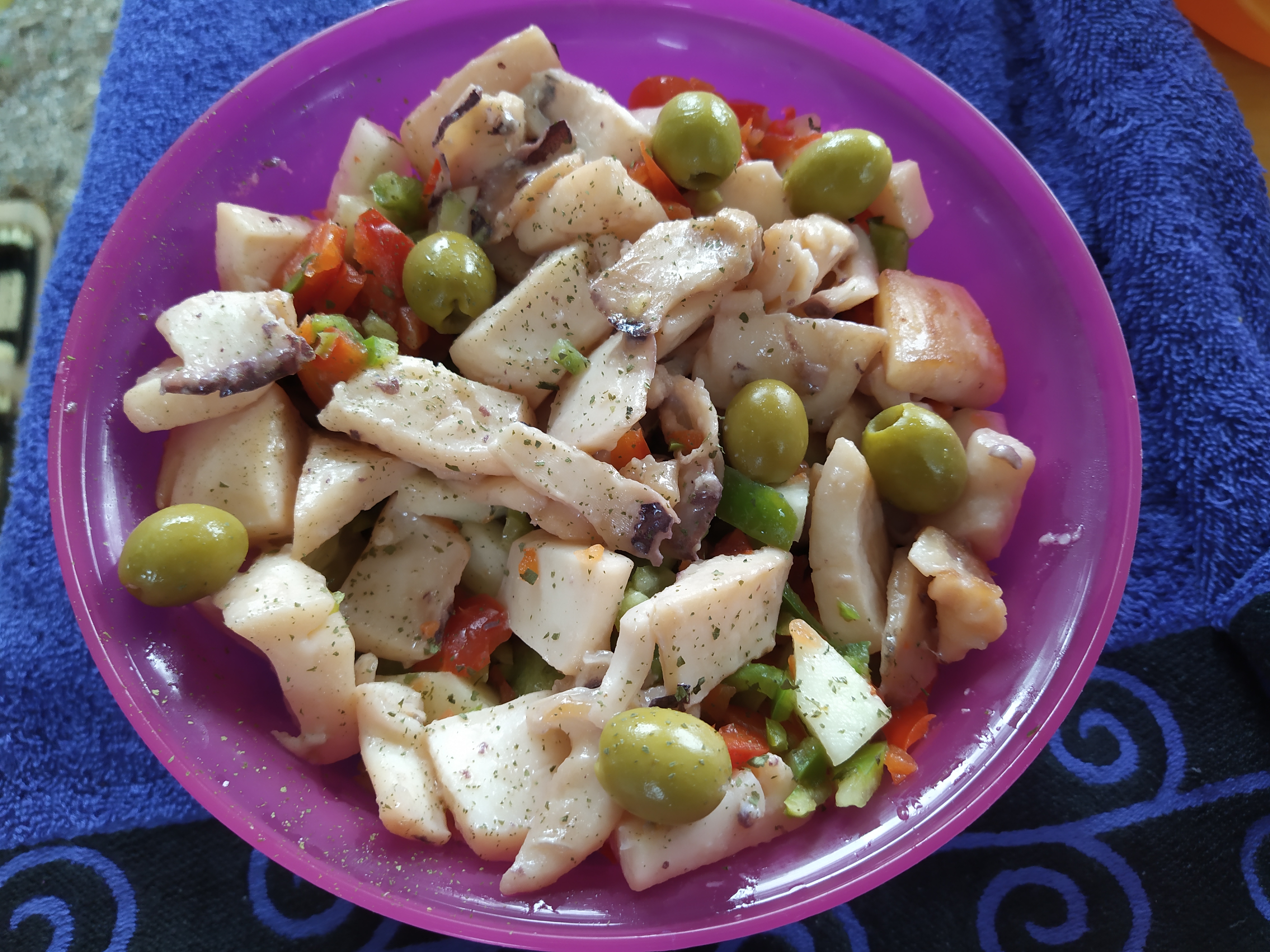 Añada la cebolla, el pimiento verde, el pimiento rojo, el tomate, el pimentón, la sal, el vinagre y el aceite. Trocee 4 seg/vel 4. Vierta sobre la sepia, añada las aceitunas y mezcle. Sirva inmediatamente.