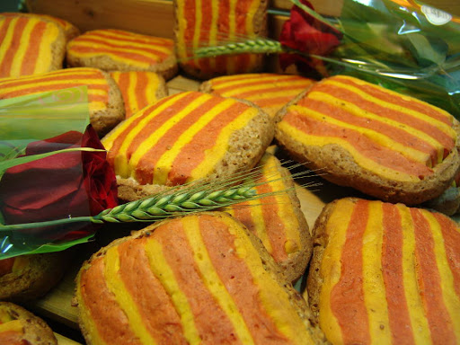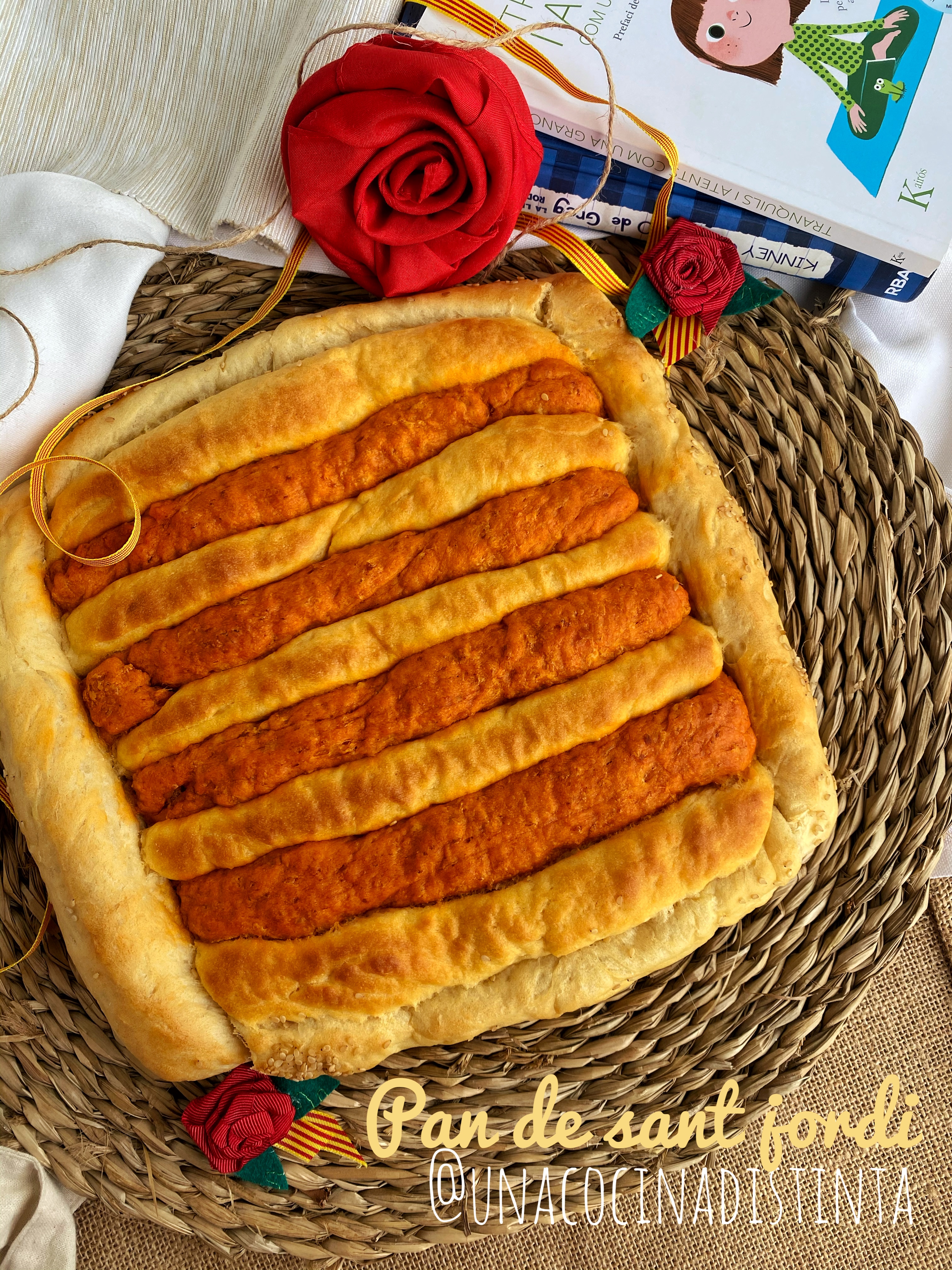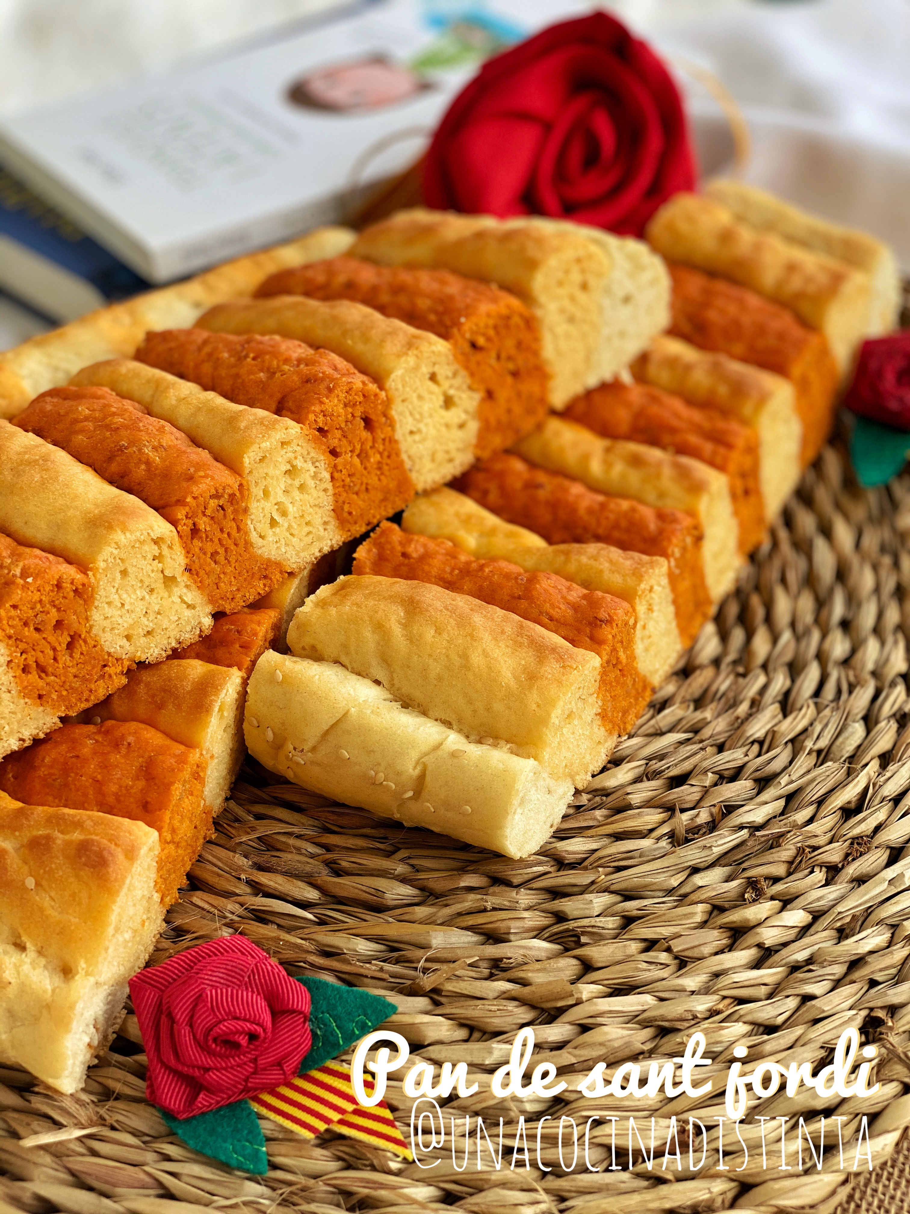 Aquí os dejo otra versión del Pan de Sant Jordi, diferente del directo que hice ayer, lo único que cambiamos es como lo montamos en vez de forma de pan de barra, hacemos churros formando la bandera sobre un papel de horno y listo!!!!