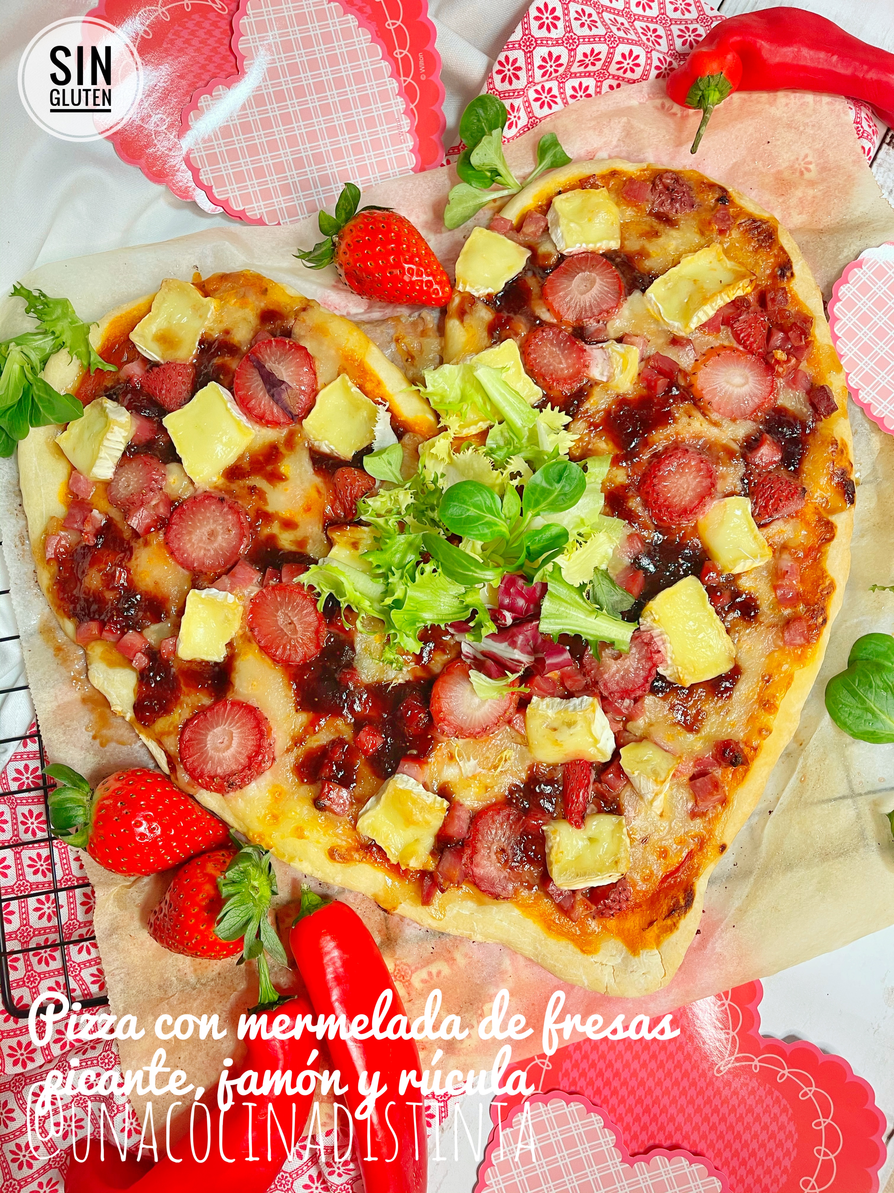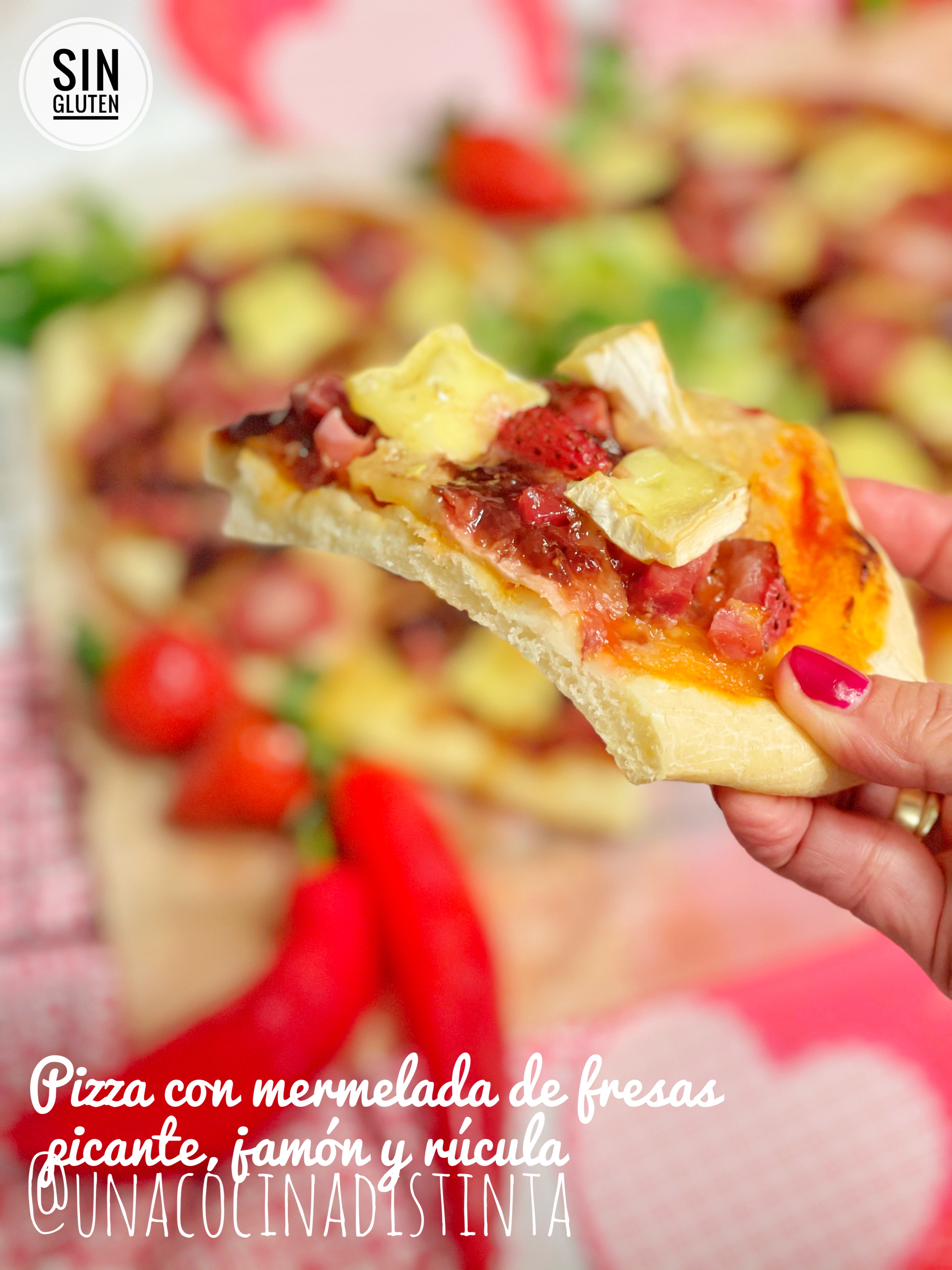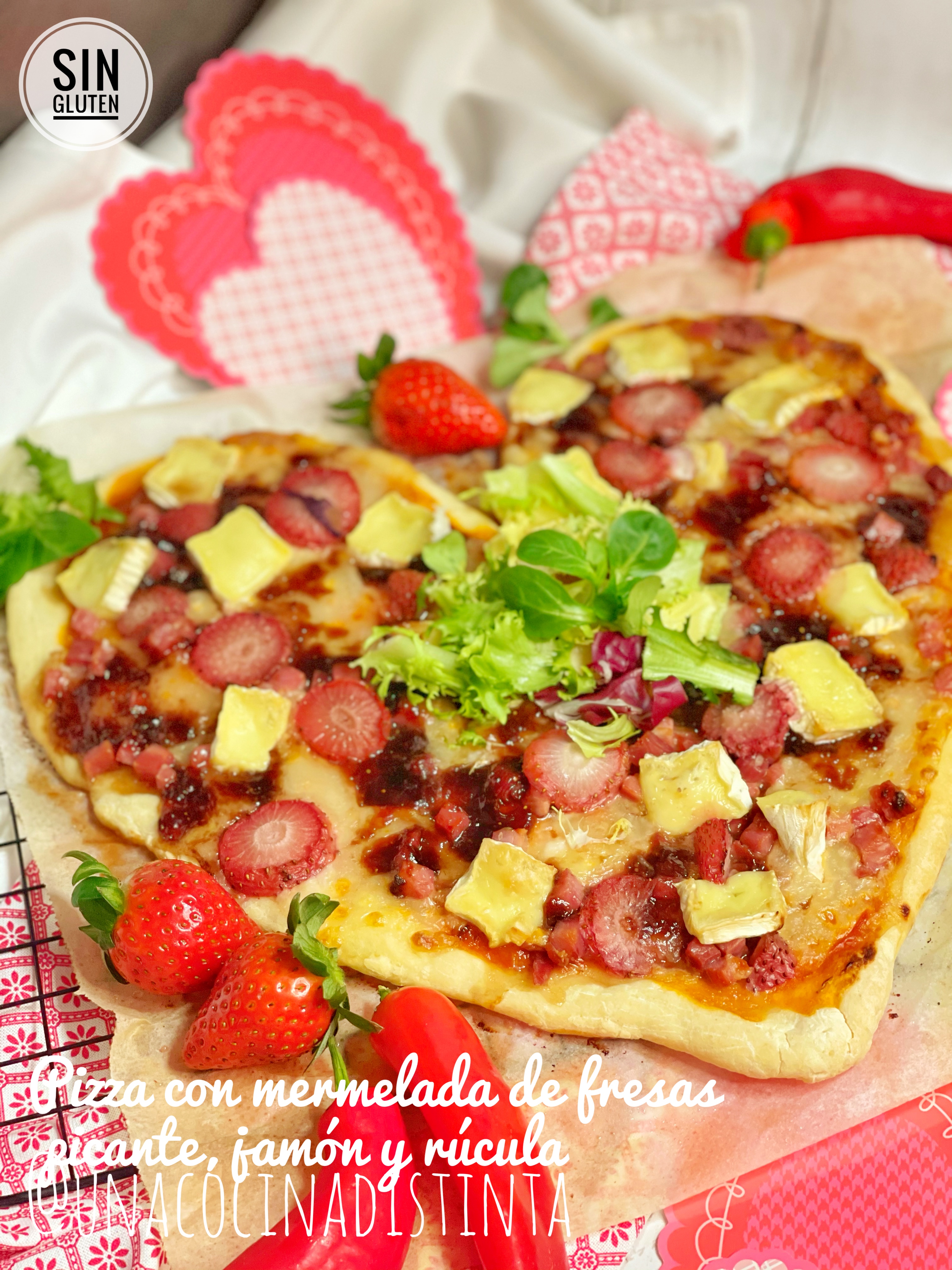 PIZZA CON MERMELADA DE FRESAS PICANTE, JAMÓN Y RÚCULA