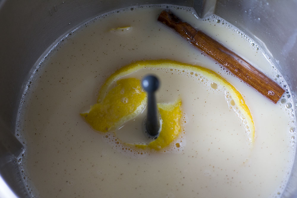 2. Añadimos la piel del limón junto con el palo de canela y programamos 11 minutos, 90º, velocidad 2. Una vez terminado el tiempo programamos otros 2 minutos a la misma velocidad.