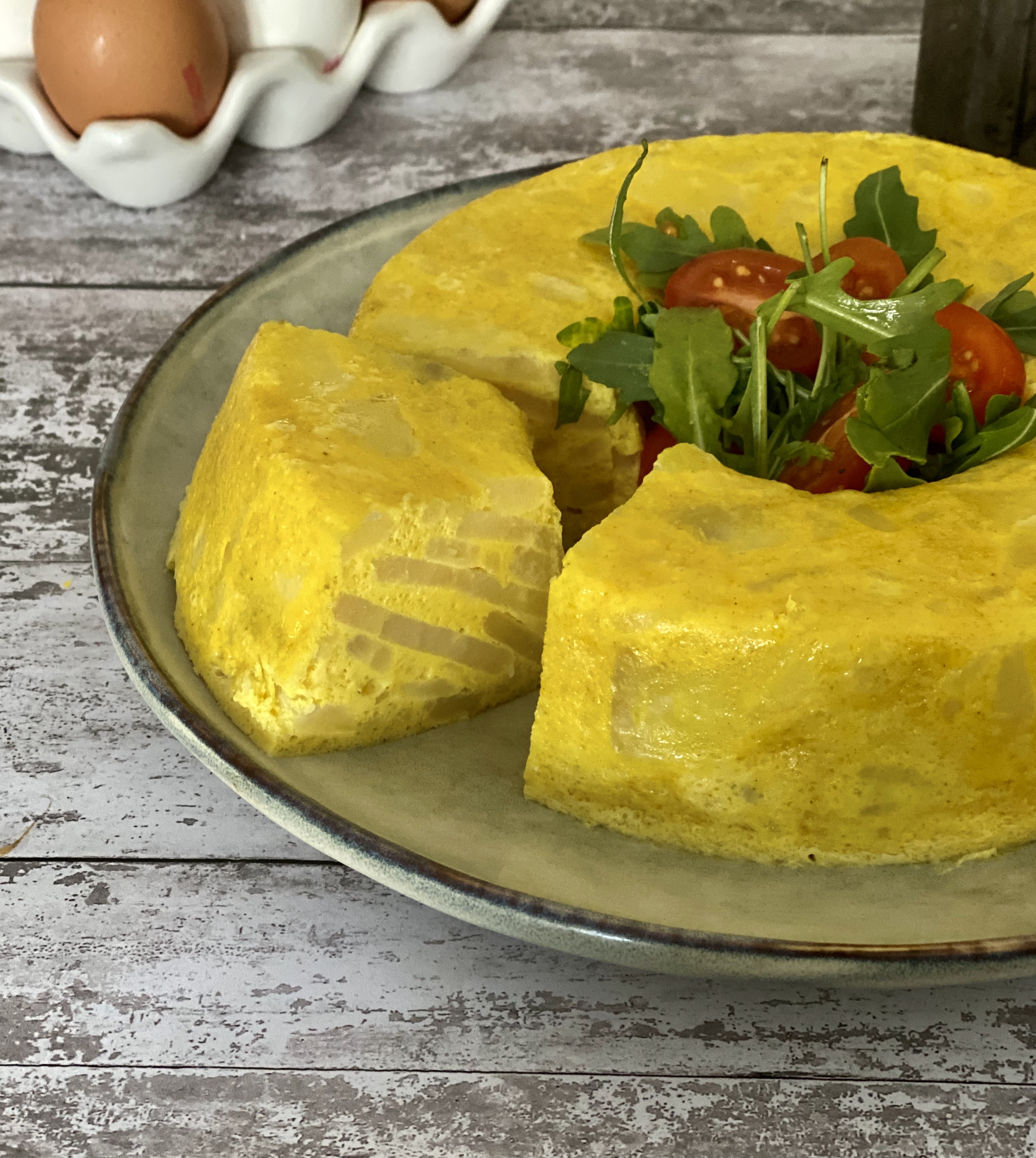 Finalizado el tiempo, compruebe que la tortilla ha cuajado, sino programe 10 minutos más a la misma temperatura y velocidad. Desmolde sobre un plato grande o bandeja y lista para servir.