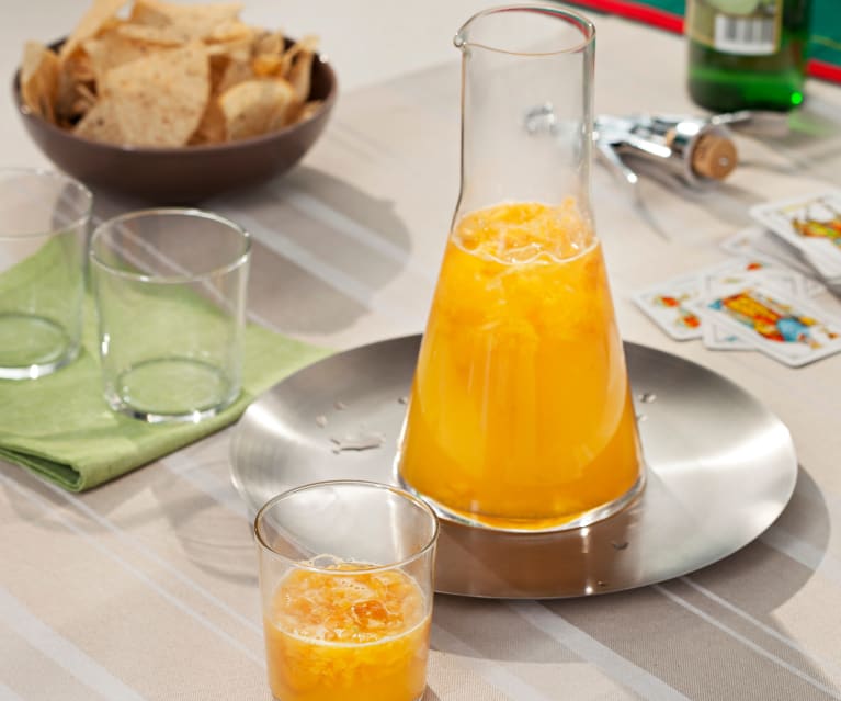Ponga en el vaso la manzana, la naranja, el limón, la sidra, el licor y el azúcar y triture 2 seg/vel 10. Introduzca el cestillo en el vaso y, sujetándolo con la espátula, vierta la sangría en la jarra junto con el melocotón. Añada los cubitos de hielo y sirva.