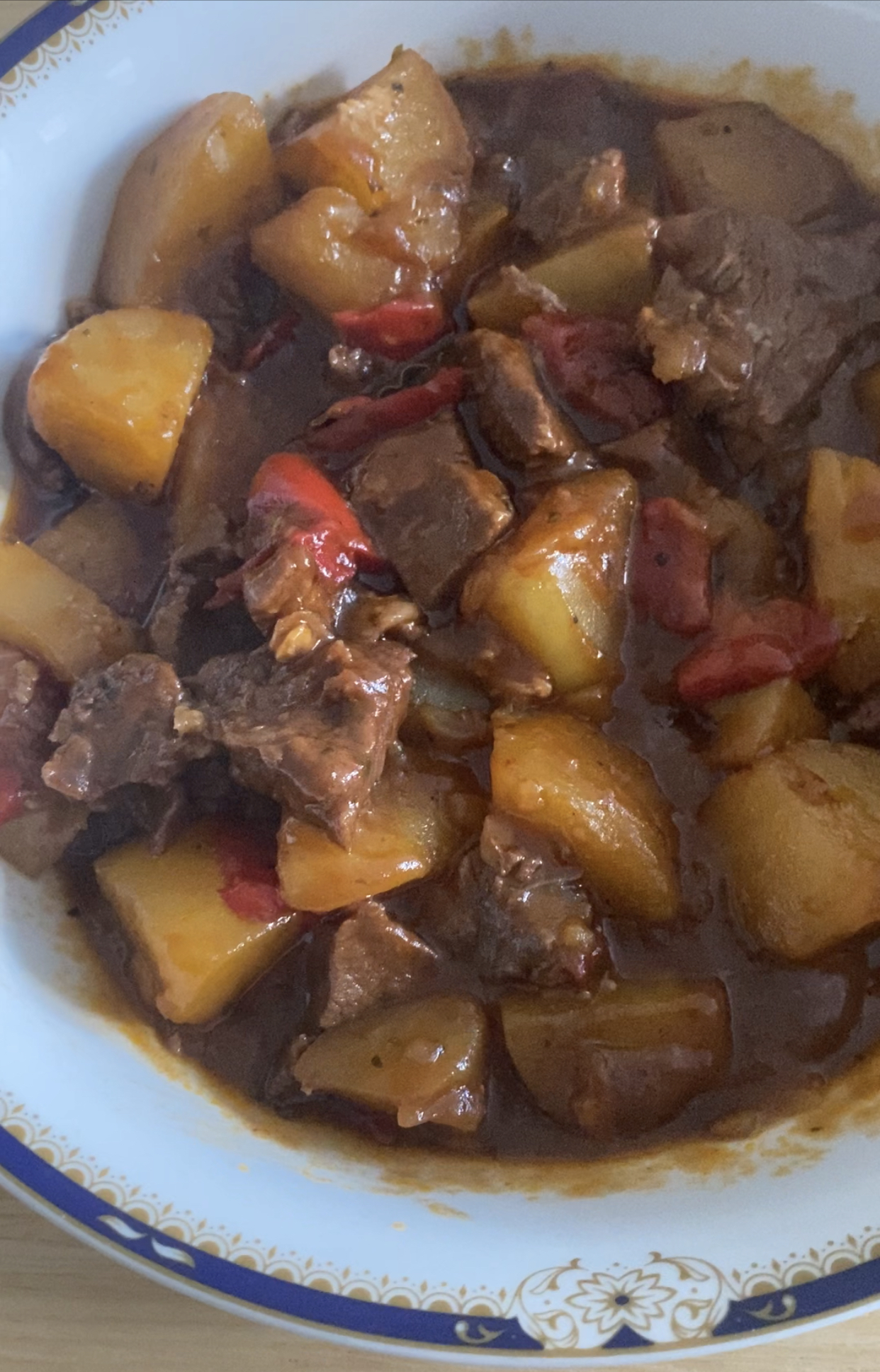 Incorpore el vino, el agua y la pastilla de caldo. Sitúe el recipiente Varoma en su posición con las patatas y las zanahorias. Tape el Varoma y programe 40 min/Varoma/giro inverso /vel cuchara . Retire el Varoma y ponga las patatas y las zanahorias en una sopera. Añada los guisantes y el contenido del vaso, mezcle con la espátula y sirva inmediatamente.