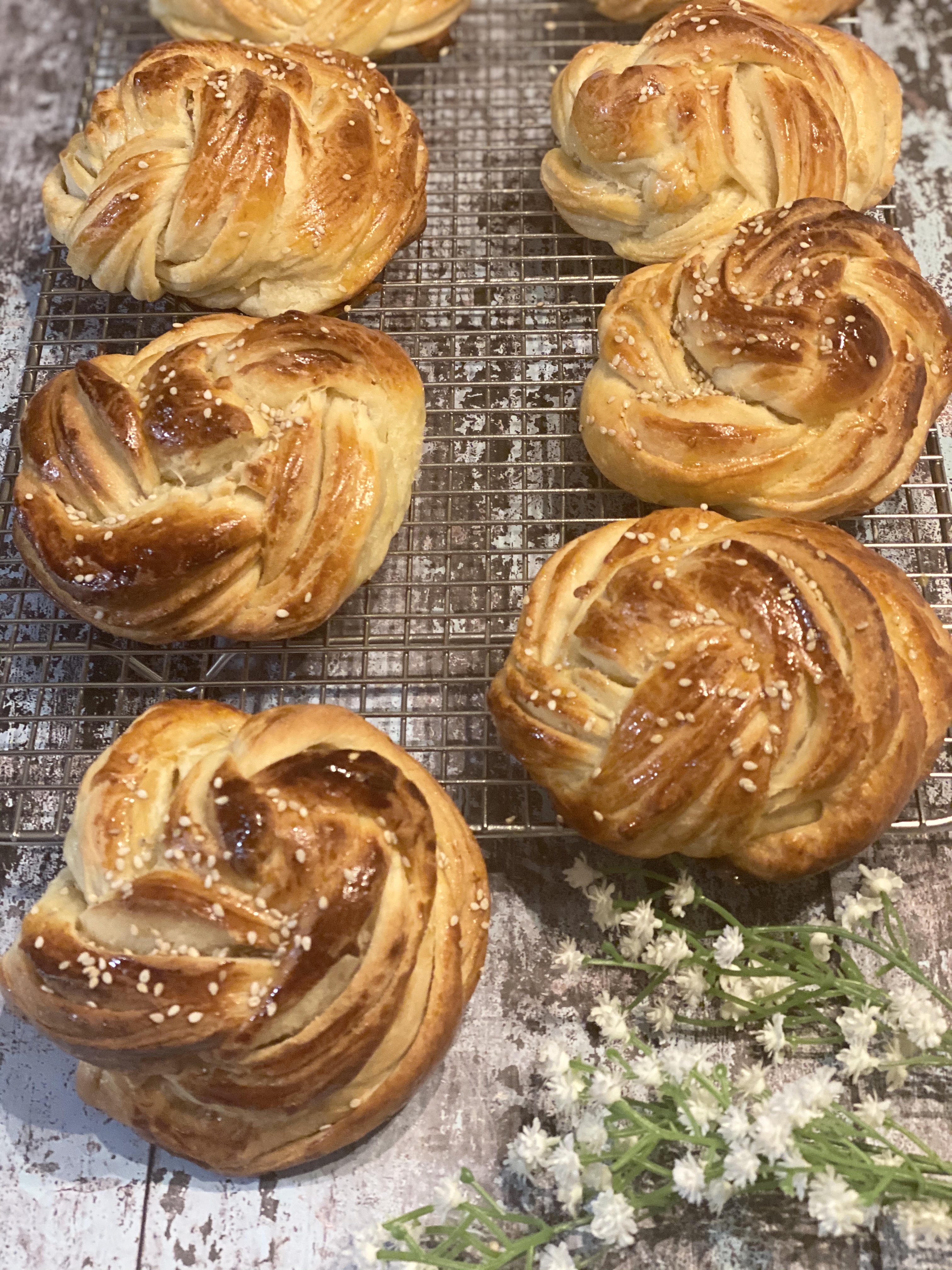 Cada una estirela con el rodillo formando un rectángulo,pincele con mantequilla, espolvoreé con azúcar y enrollé la masa por el extremo más ancho hasta formar un cilindro, córtelo al medio con un cuchillo o rasqueta y forme una trenza, la enrollamos hasta formar una rosca, lo hacemos con todas las bolas de masa.