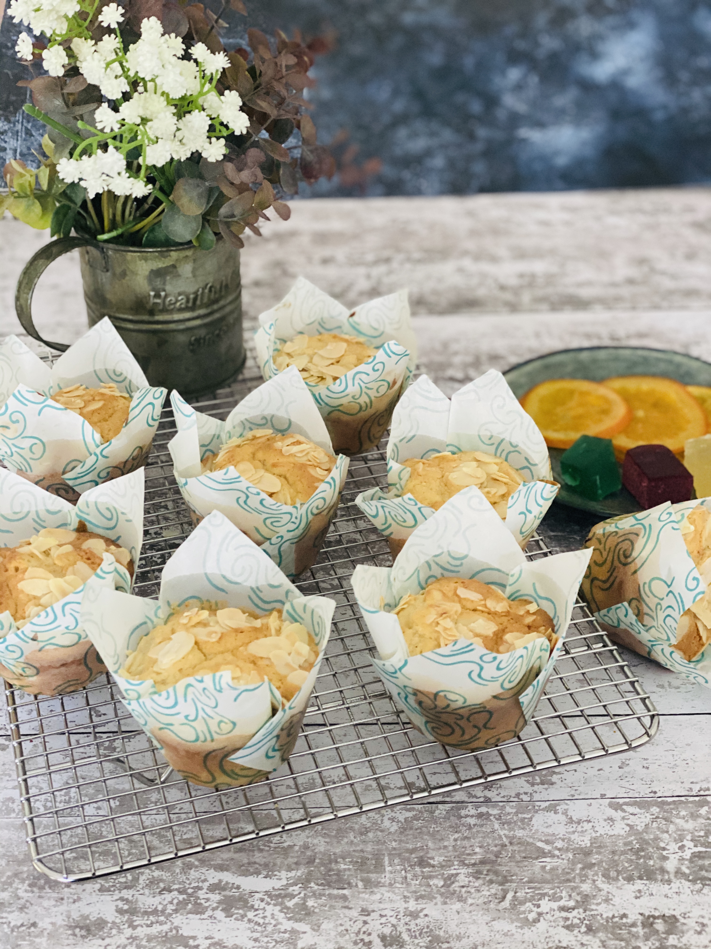 Incorpore las frutas confitadas, mezcle 10 seg/inverso/vel 3 y termine de envolver con la espátula. Rellene los moldes de magdalenas hasta las ¾ partes y reparta por encima las almendras laminadas.
