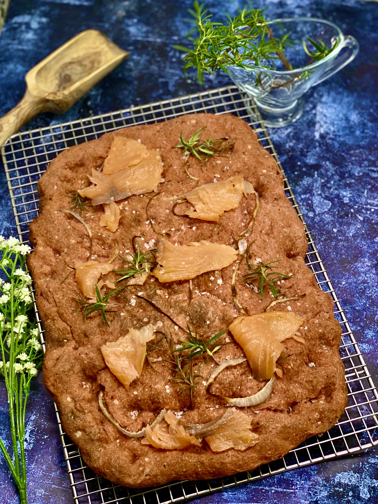 Hornee durante 30-35 minutos o hasta que esté ligeramente dorada. Retire del horno y deje enfriar unos minutos. Distribuya el salmón ahumado y 1-2 ramitas de romero fresco por la superficie. Corte en porciones y sirva.