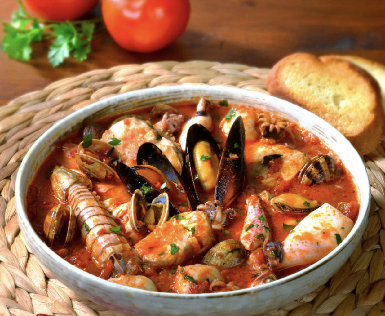 Incorpore el tomate, el tomate concentrado, el vino blanco, el vinagre y la sal. Sitúe el recipiente Varoma en su posición con la merluza, el rape y la sepia. Coloque la bandeja Varoma con los gambones, los mejillones y las almejas. Tape el Varoma y programe 25 min/Varoma/vel 1. Mientras tanto, tueste las rebanadas de pan. Retire el Varoma y ponga en una fuente honda el pescado y el marisco. Riegue con la salsa del vaso, espolvoree con el perejil y sirva.