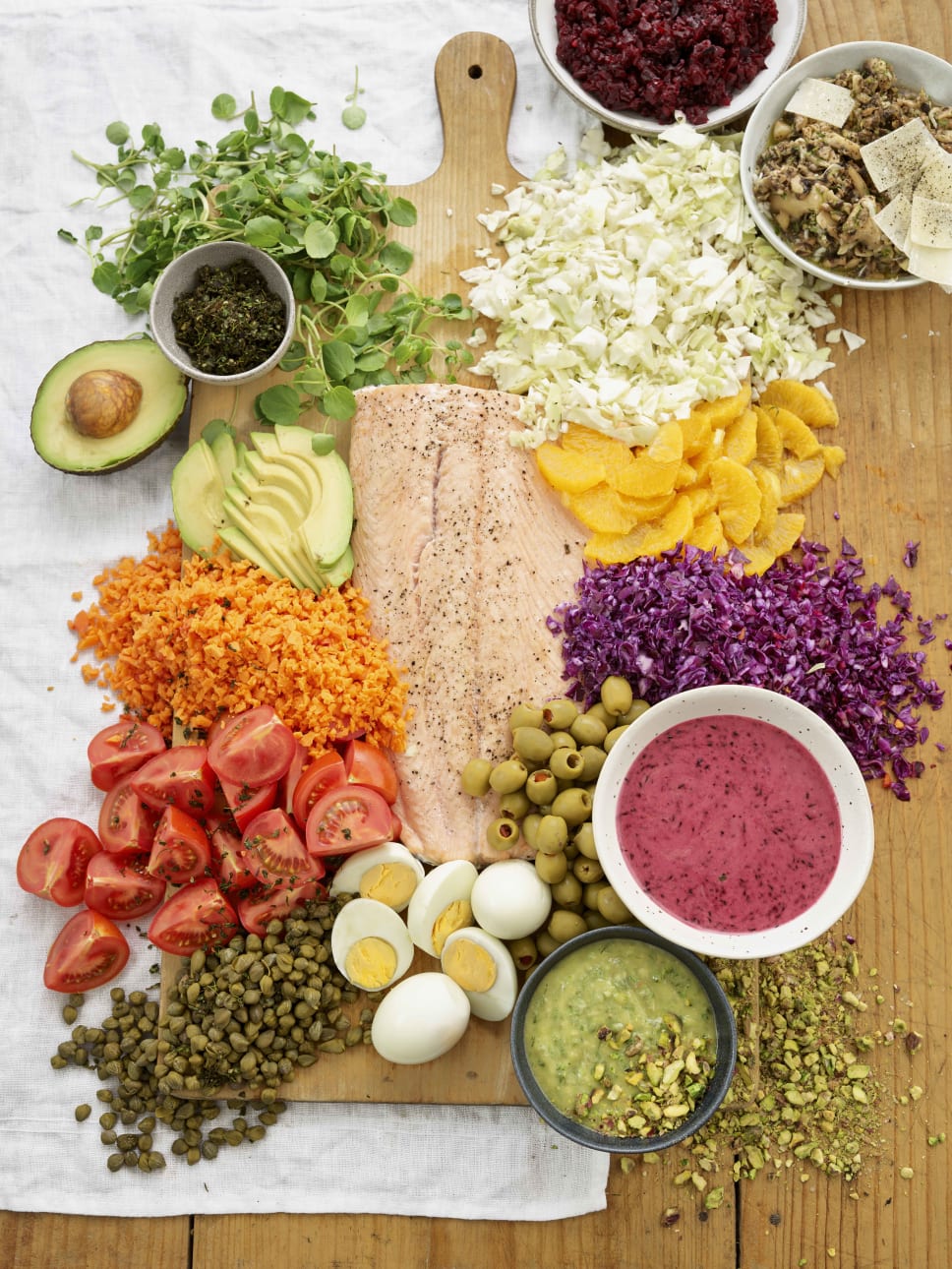• Base: : escoge una de las siguientes opciones o mezcla varias de ellas: hojas verdes (lechuga, col, rúcula y espinaca), repollo rojo o blanco cortado en tiras, pasta, arroz, o cereales hervidos, como quinoa, trigo bulgur o farro.