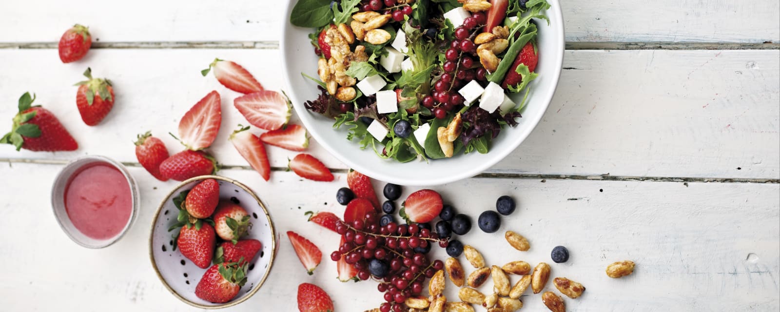 Ensaladas: pon un toque de color y sabor añadiendo frutos rojos frescos a la ensalada, o o a la vinagreta. La Ensalada de verano hecha con fresas es una buena opción para el verano.