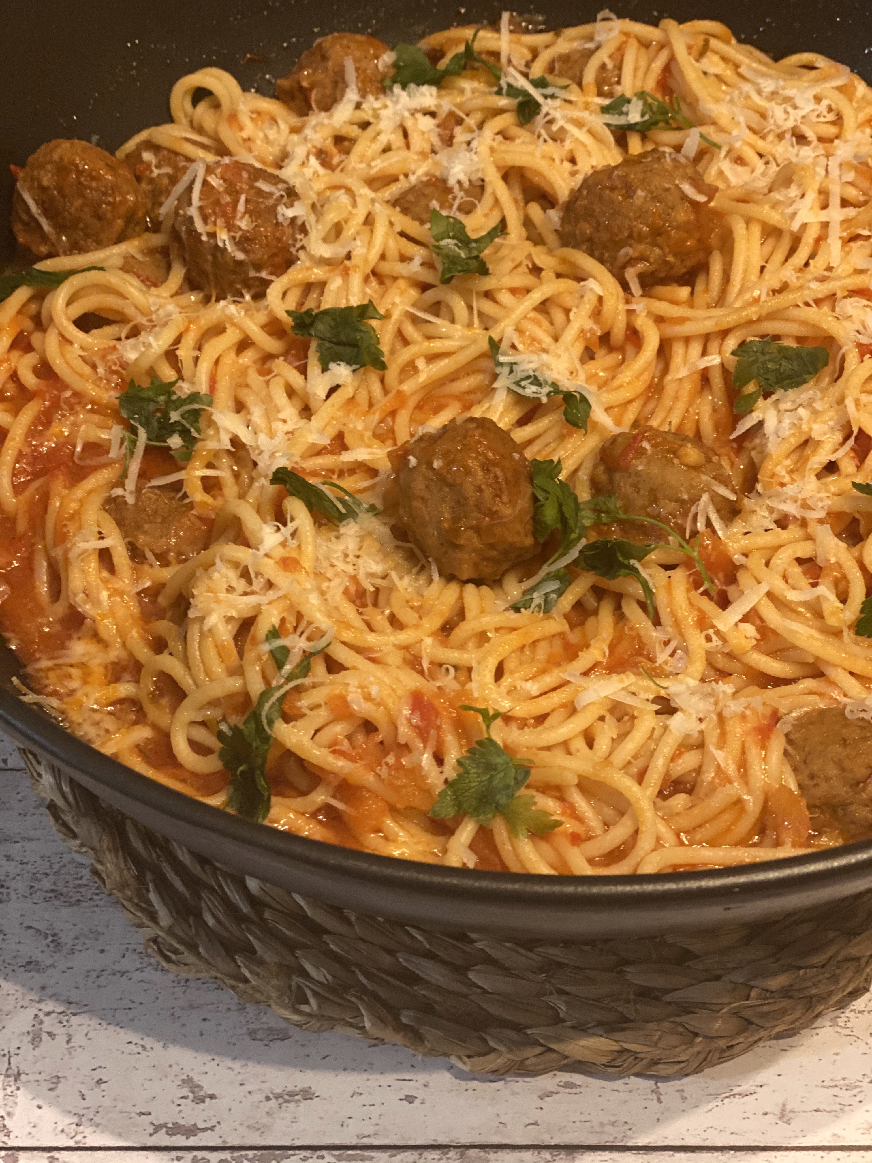 Añada los espaguetis partidos por la mitad. Sitúe el recipiente Varoma en su posición y programe el tiempo indicado en el paquete/100°C/giro inverso /vel cuchara Retire el Varoma y ponga las albóndigas en una fuente. Vierta los espaguetis con tomate sobre las albóndigas, mezcle con la espátula y sirva.