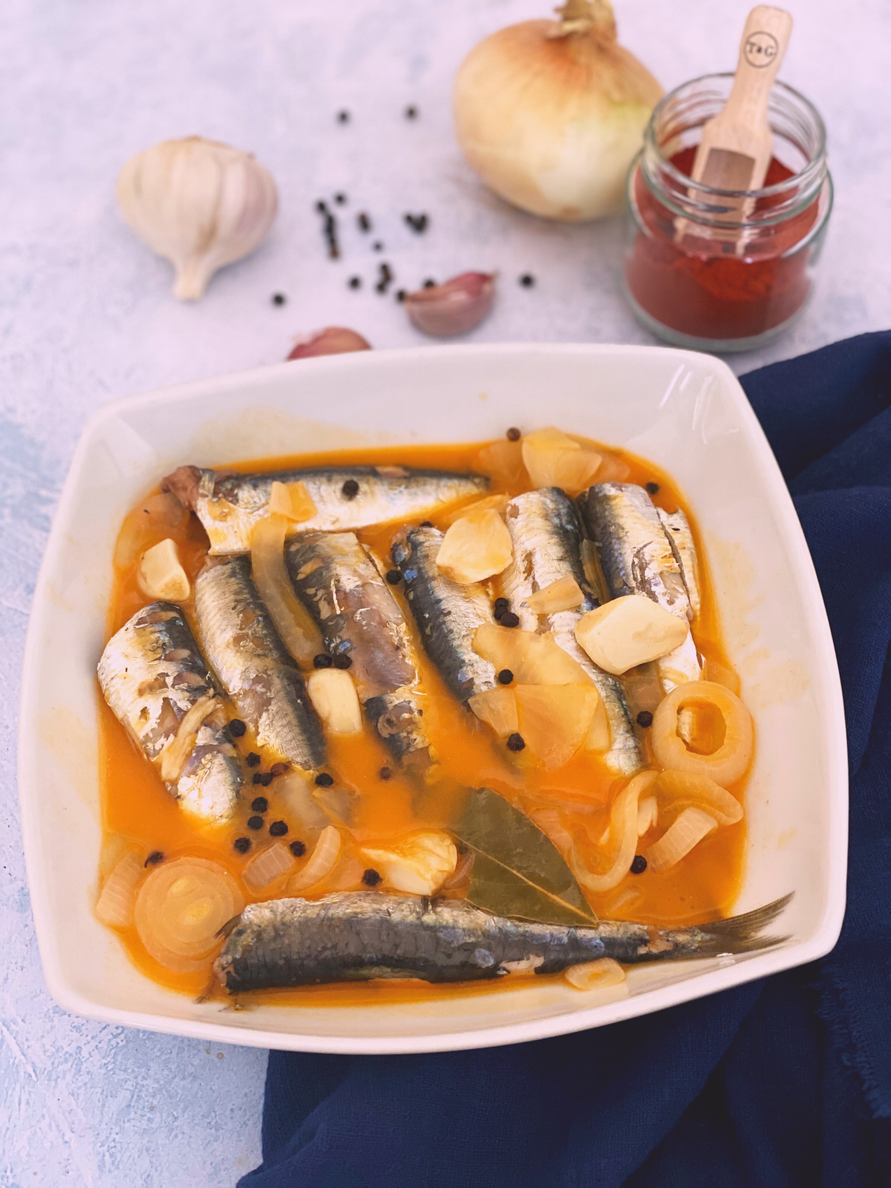 Añada al vaso 1½ cucharaditas de sal ,el vinagre, la cucharadita de pimentón De la Vera y programe 5 min/Varoma/giro inverso/vel 1. Coloque las sardinas en un recipiente hermético y cubra con el escabeche del vaso. Reserve en el frigorífico durante 48 horas. Sirva frías.